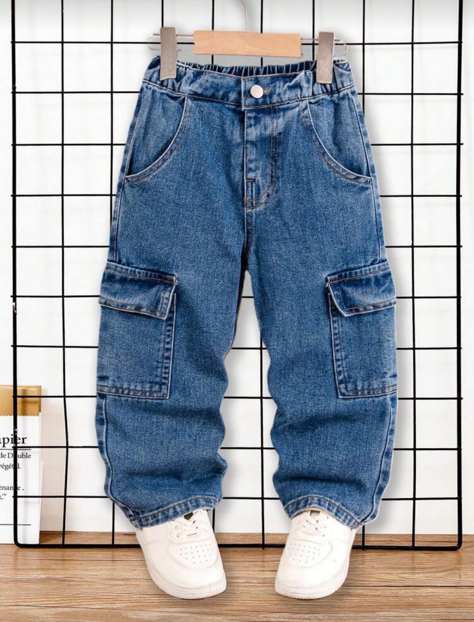 بنطلون جينز أولادي بتصميم كارجو عصري، يجمع بين العملية والستايل المميز، مناسب للخروجات، المدرسة، واللبس اليومي بإطلالة شبابية مريحة