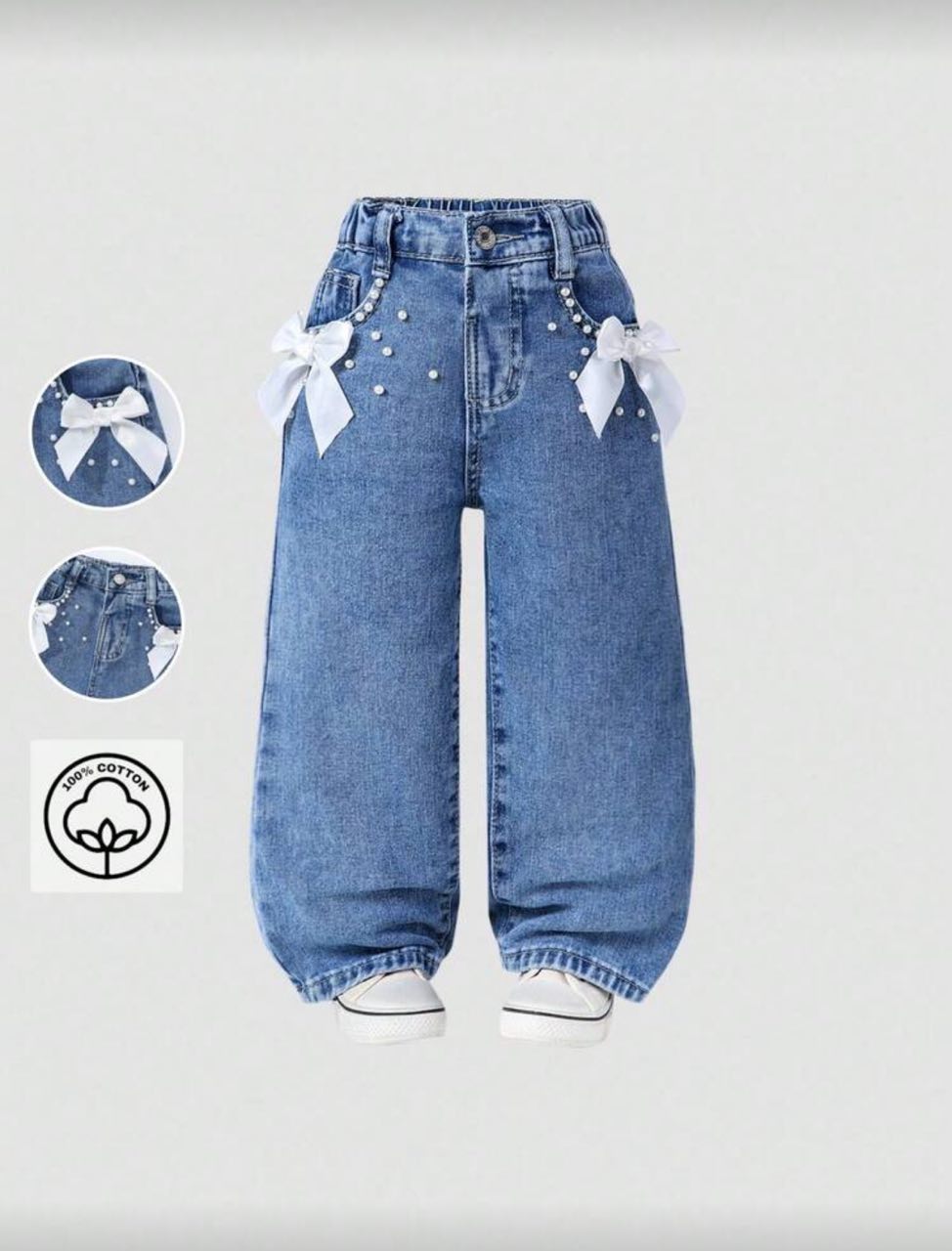 البنطلون مصنوع من خامة جينز قطن 100% مريحة على البشرة وتتحمل حركة الأطفال طوال اليوم، بقَصة وايد ليج واسعة تعطي حرية في الحركة وستايل ترندي محبب للبنات