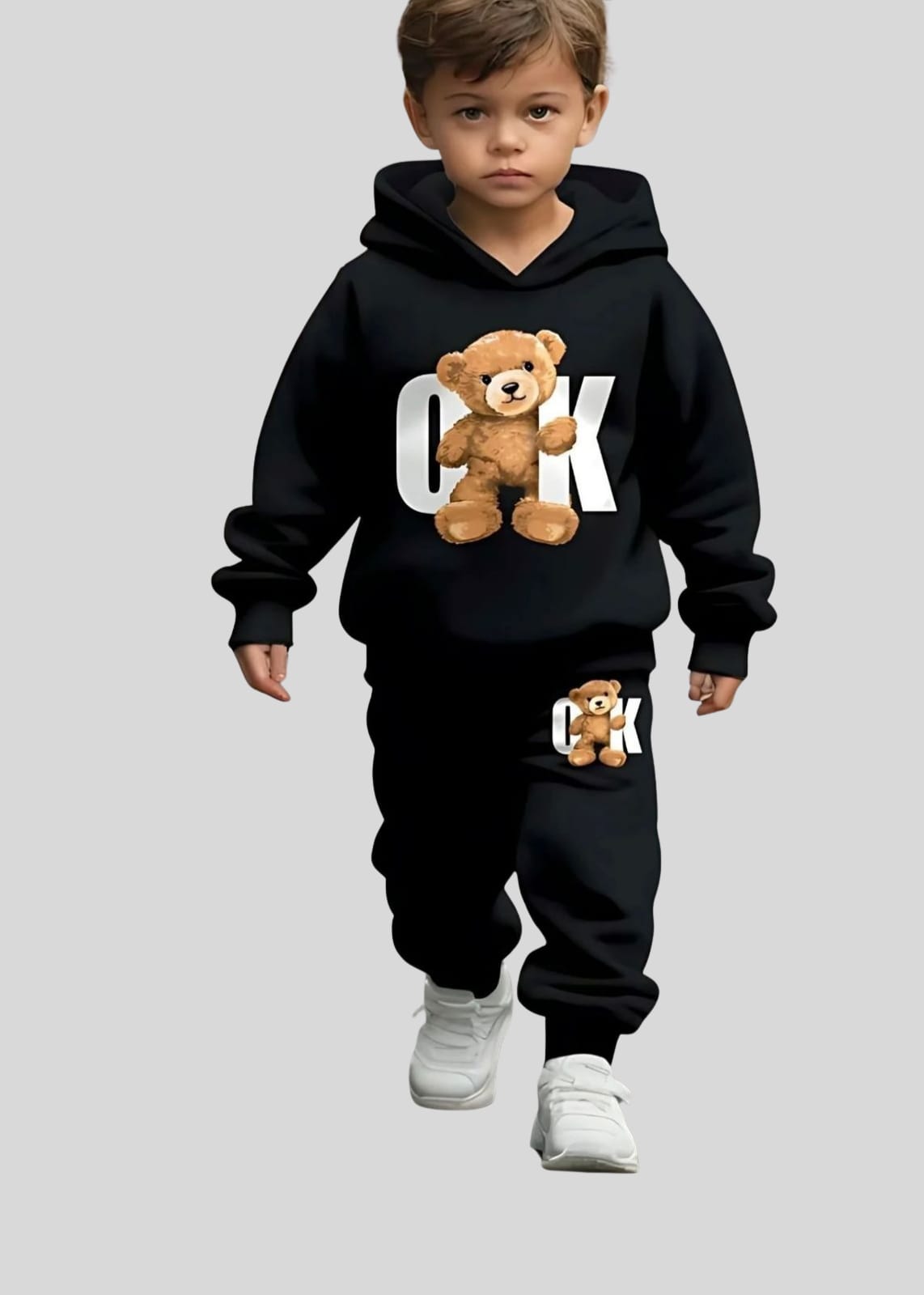 ترنج أسود أنيق بلمسة مرحة من الدبدوب البارز على البلوزة والبنطلون، تصميم عملي ومريح مثالي لخروجات الشتاء والدفا في البيت