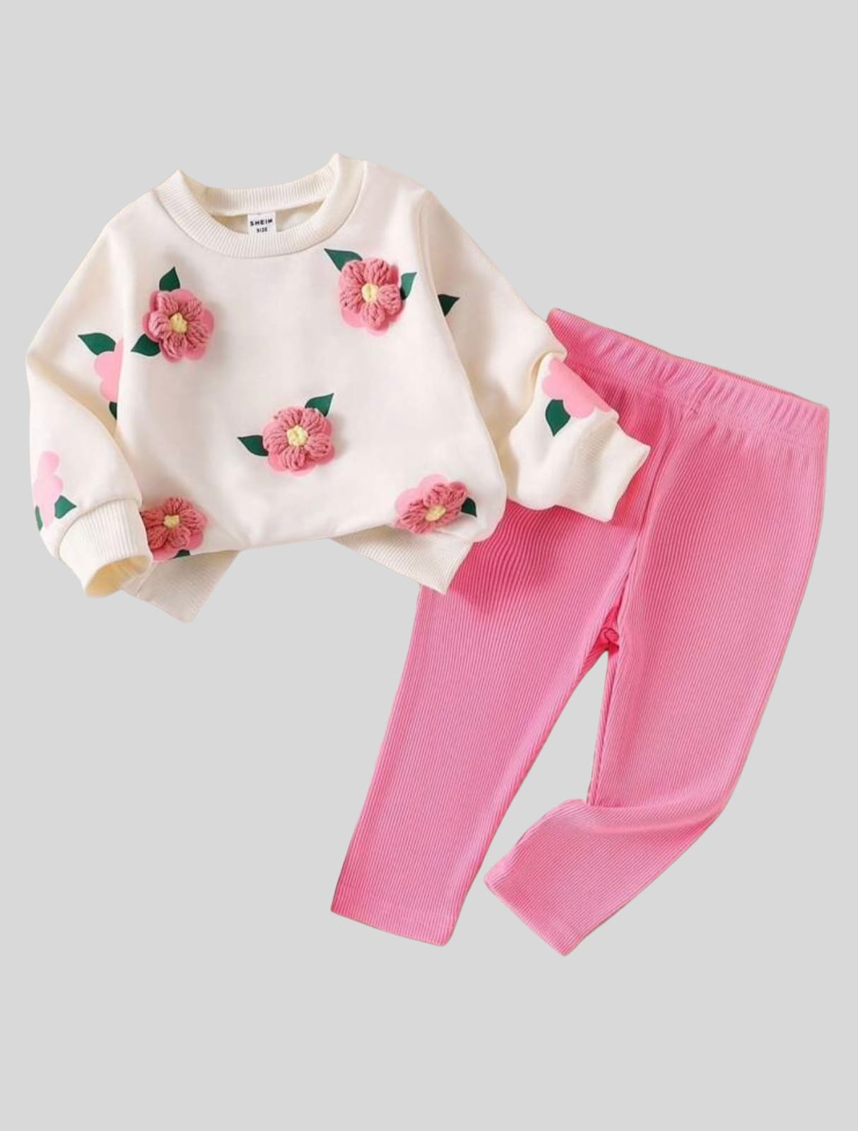ترنج بناتي أنيق مكوّن من بلوزة باللون الأبيض مزينة بورود بارزة ثلاثية الأبعاد وسروال قطني وردي ناعم بملمس مريح على البشرة