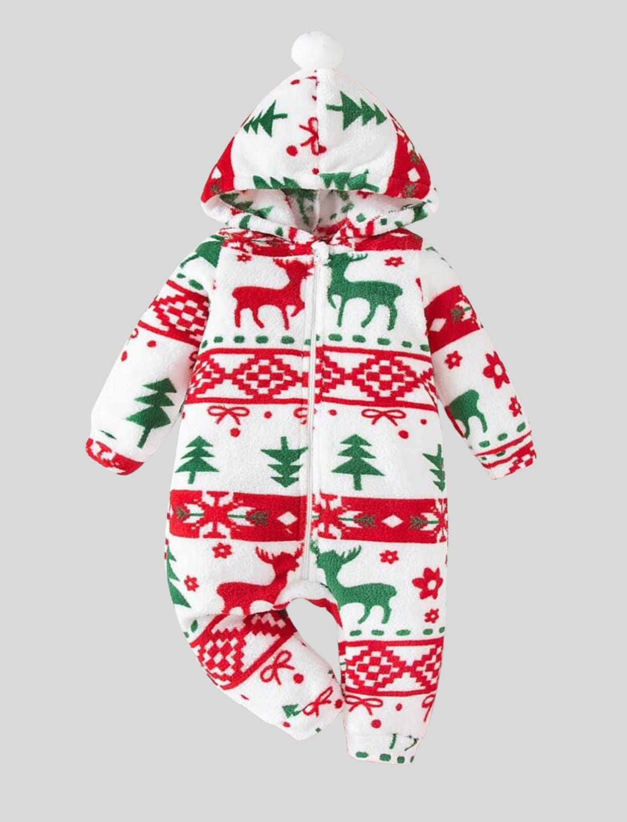 سالوبيت مواليد شتوي بملمس فرو ناعم على البشرة يوفر دفا مريح طول اليوم. تصميم قطعة واحدة مع سوستة أمامي كامل لتغيير أسرع بدون مجهود، وكابيشو مبطّن بكرّة ديكورية تعطي شكل ظريف