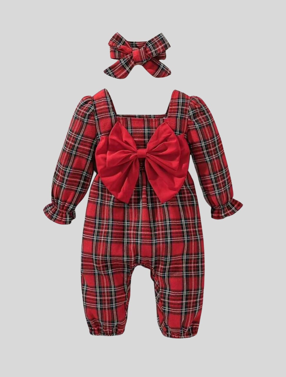 التصميم عبارة عن أوفرول طويل بأكمام منفوخة خفيفة بتخلي الشكل شيك جدًا، مع فيونكة حمراء كبيرة في المنتصف وملحق توكة شعر بنفس النقشة لإطلالة كاملة