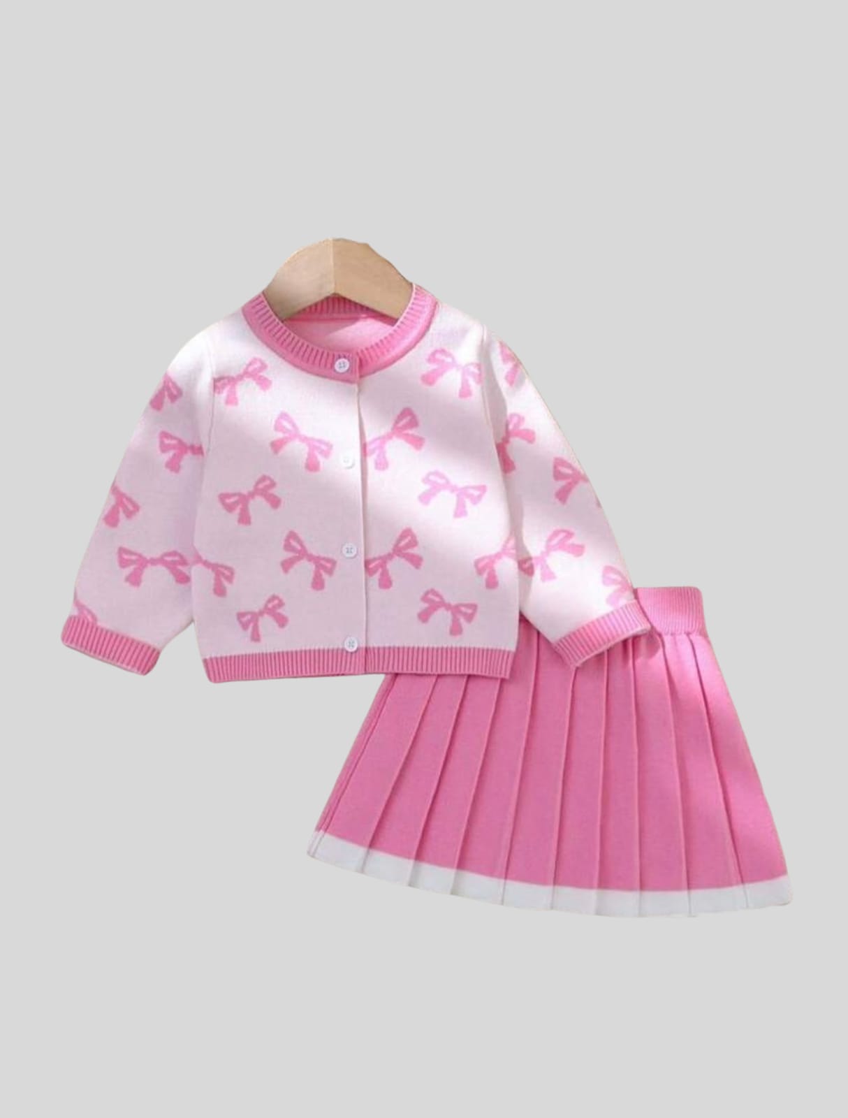 طقم ناعم ودافئ بتصميم أنثوي رقيق مزين برسومات فيونكات وردية تضيف لمسة لطافة للبنوتة