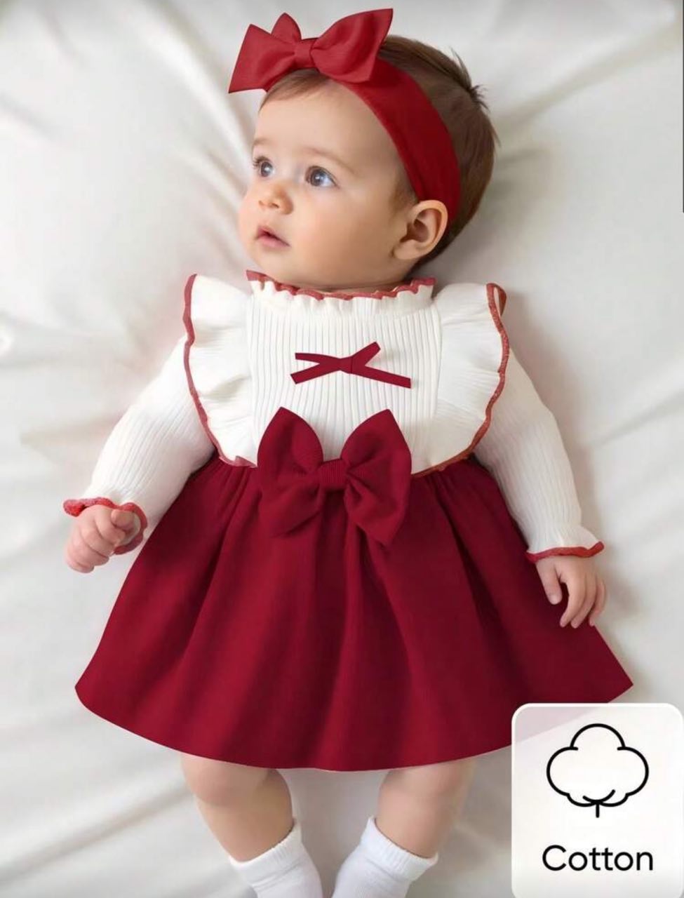 الفستان مصنوع من خامة قطنية مريحة على بشرة الأطفال، ناعمة ولطيفة تناسب بشرتهم الحساسة وتوفر راحة طوال اليوم. التصميم يجمع بين الجزء العلوي باللون الأبيض بأكمام طويلة وتفاصيل كشكشة رقيقة، مع تنورة باللون الأحمر الجذاب تضيف لمسة فخامة وأناقة